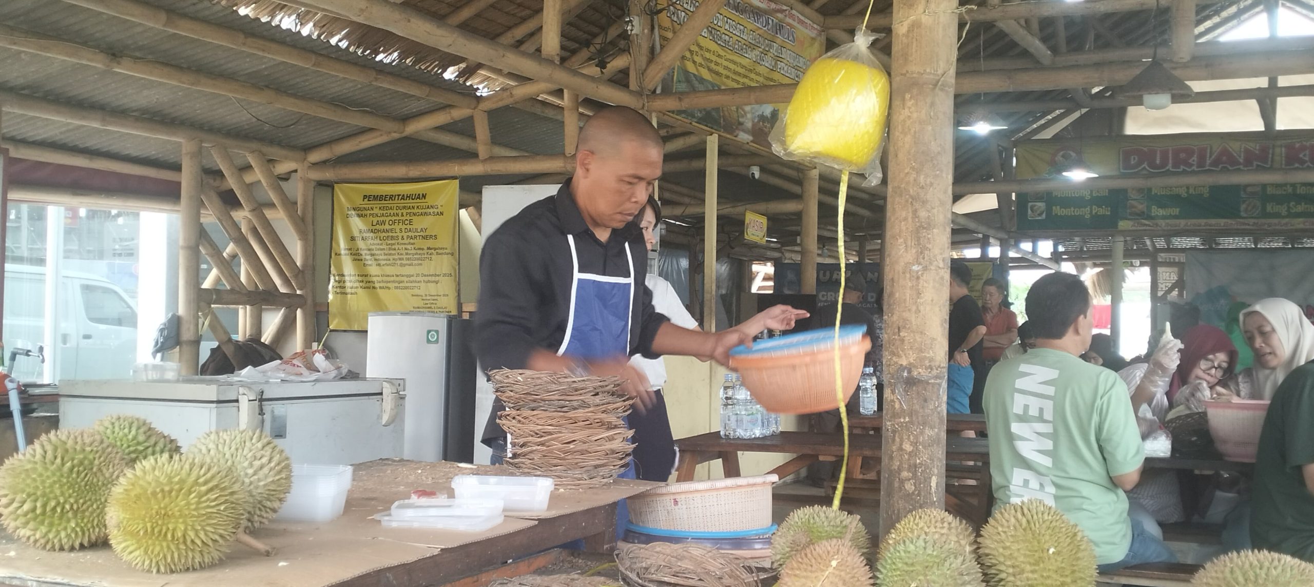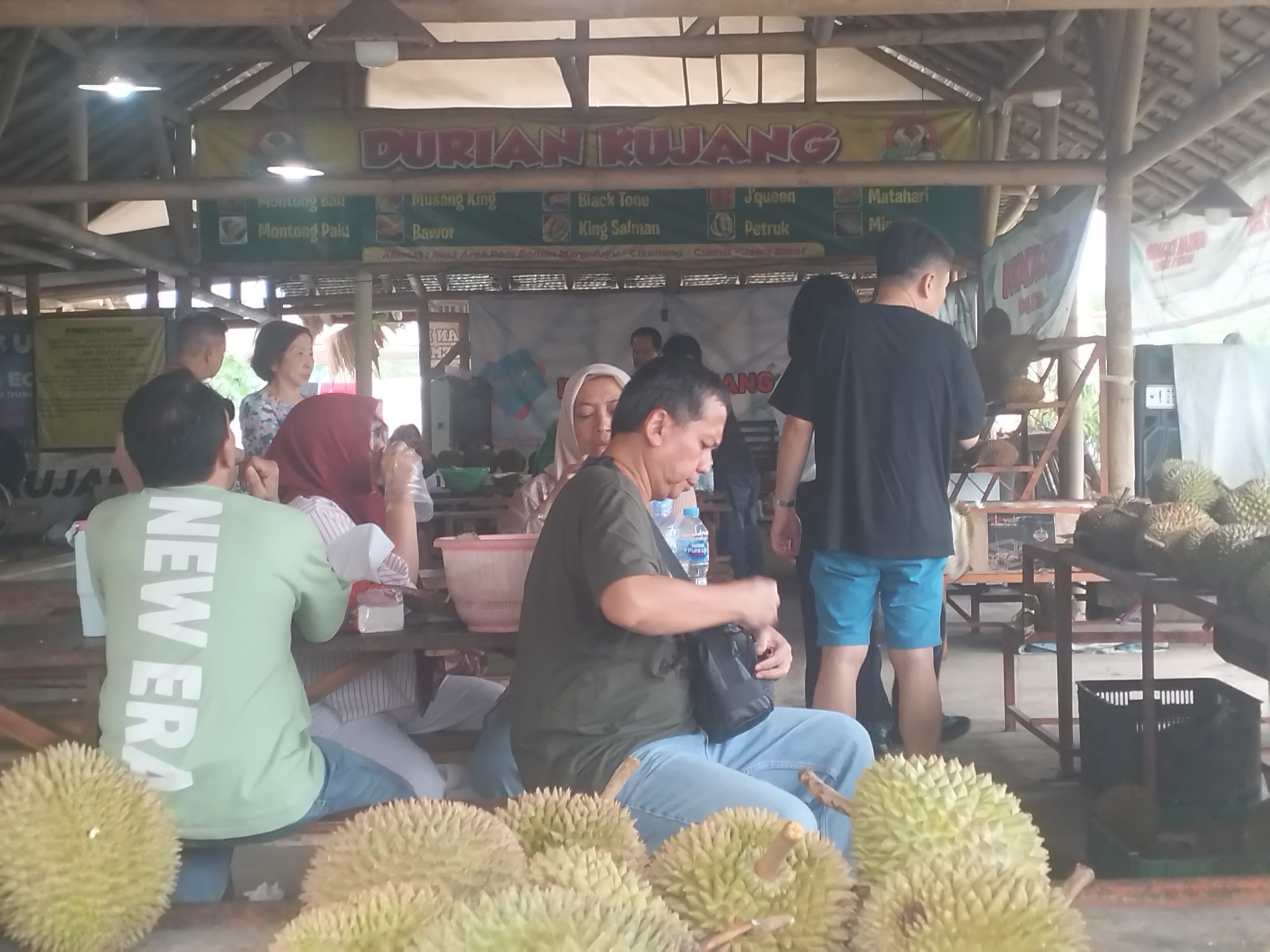 Berdasarkan pantauan di lokasi, kedai yang memiliki konsep bangunan bambu tradisional ini nampak dipadati pengunjung sejak pagi hari. Deretan buah durian segar tertata rapi di area depan, siap dipilih oleh para pelanggan yang ingin menikmati sensasi “makan di tempat”.